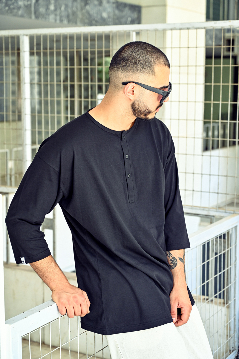 100% cotton / drop shoulders / 3/4 sleeve / button through